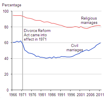In 1966, 95% of religious marriages were between people who had not been married before, a percentage which steadily decreased to 82% in 2011. This fall may be because it has become more acceptable for those who have previously been married to have a religious ceremony.