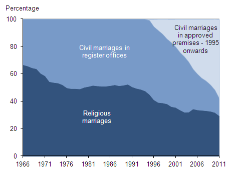 Since the 1960s, the proportion of marriages in England and Wales that are religious ceremonies has decreased and the proportion of marriages that are civil ceremonies has increased.